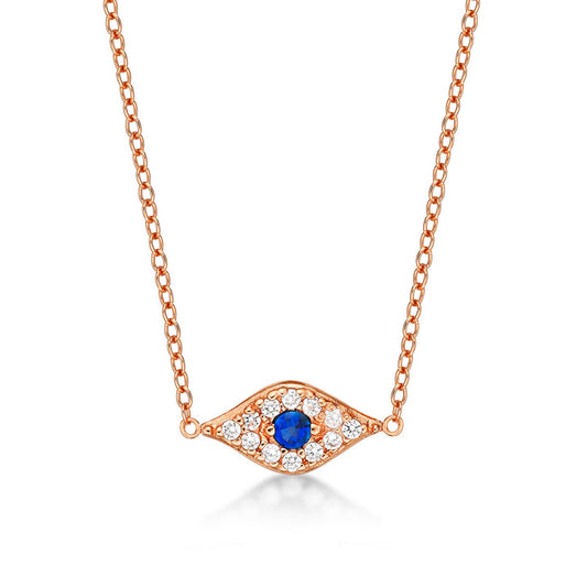 Features:• Rose Gold plated necklace for women with an evil eye pendant set with white and blue cubic zirconia stones.• Cute evil eye necklaces for women with a small 6mm by 11mm evil eye pendant on an adjustable 18” chain, including 2-inch extension links.• Rose gold plated solid silver chain...