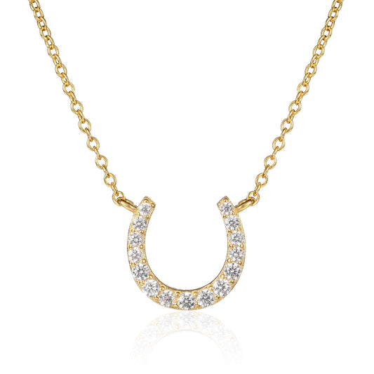 Features• Gold plated necklace for women with a horseshoe pendant set with sparkling Cubic Zirconia stones.• Cute horseshoe necklaces for women with a 12 by 12mm horseshoe pendant on an adjustable 18-inch chain, including 2-inch extension links.• Gold plated solid silver chain and pendant. This elegant gold necklace for women...