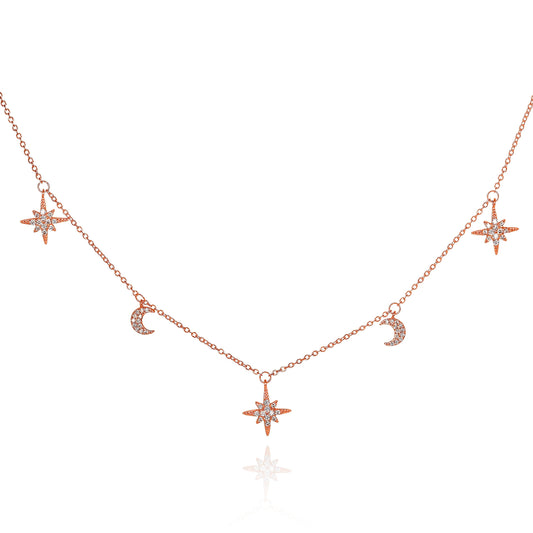 Features• Rose gold plated necklace for women with 3 star charms and 2 crescent moon charms set with cubic zirconia stones. • Cute moon and star necklaces for women with 12 mm x 12 mm north star charms and 7 mm x 6 mm crescent moon charms. 16 inch long...
